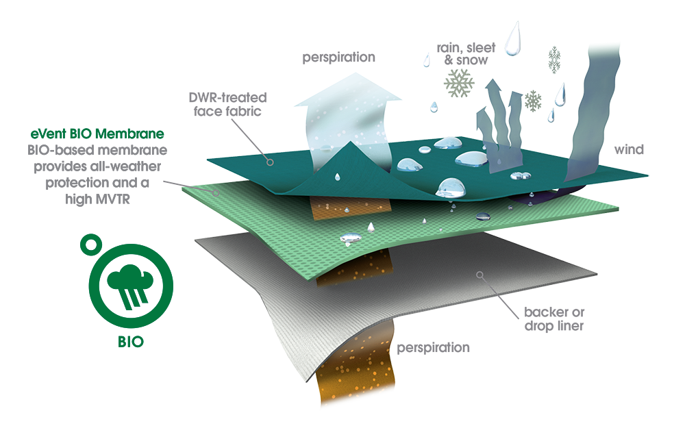 - eVent BIO made with 97% renewable carbon, 100% waterproof